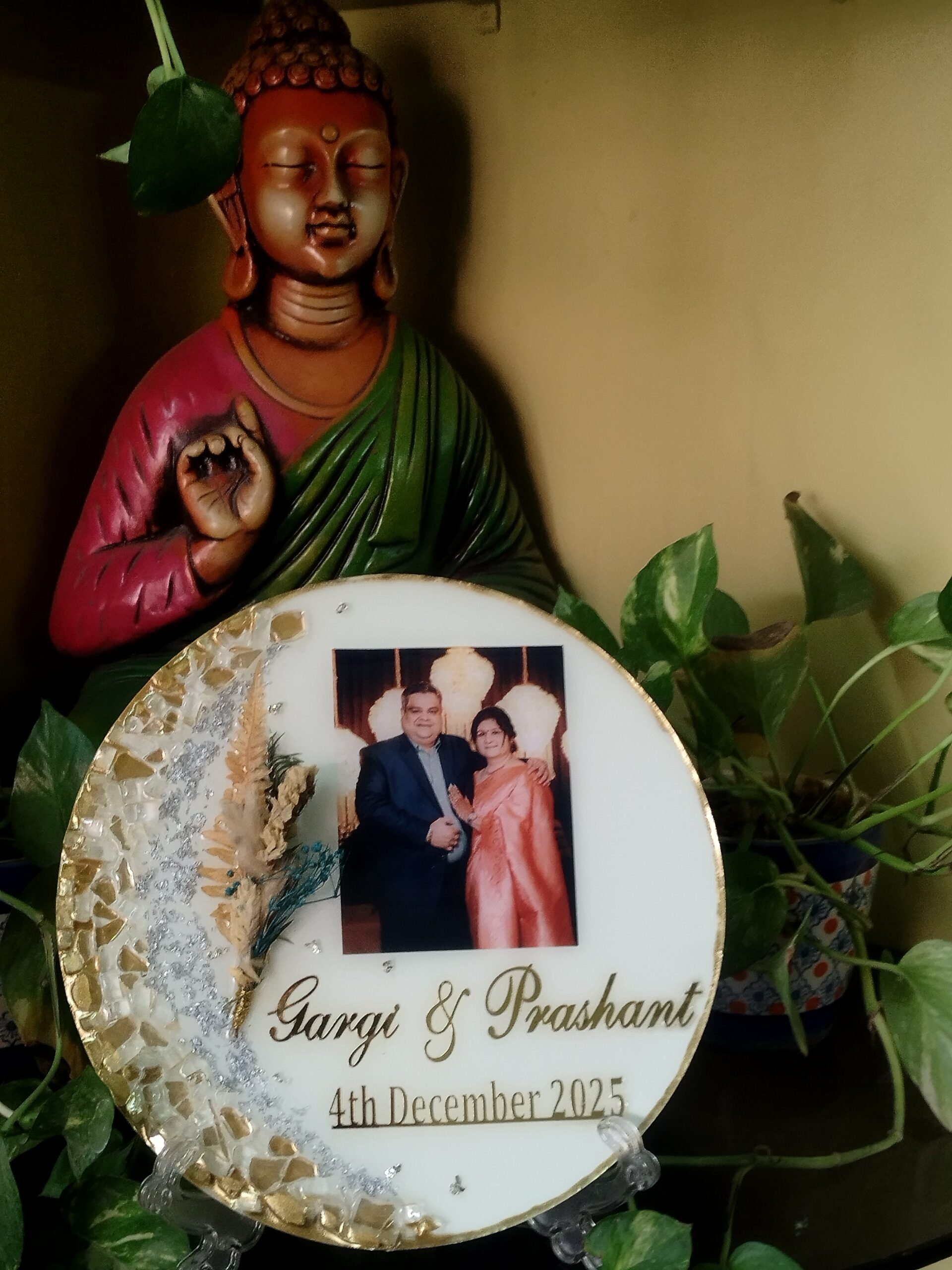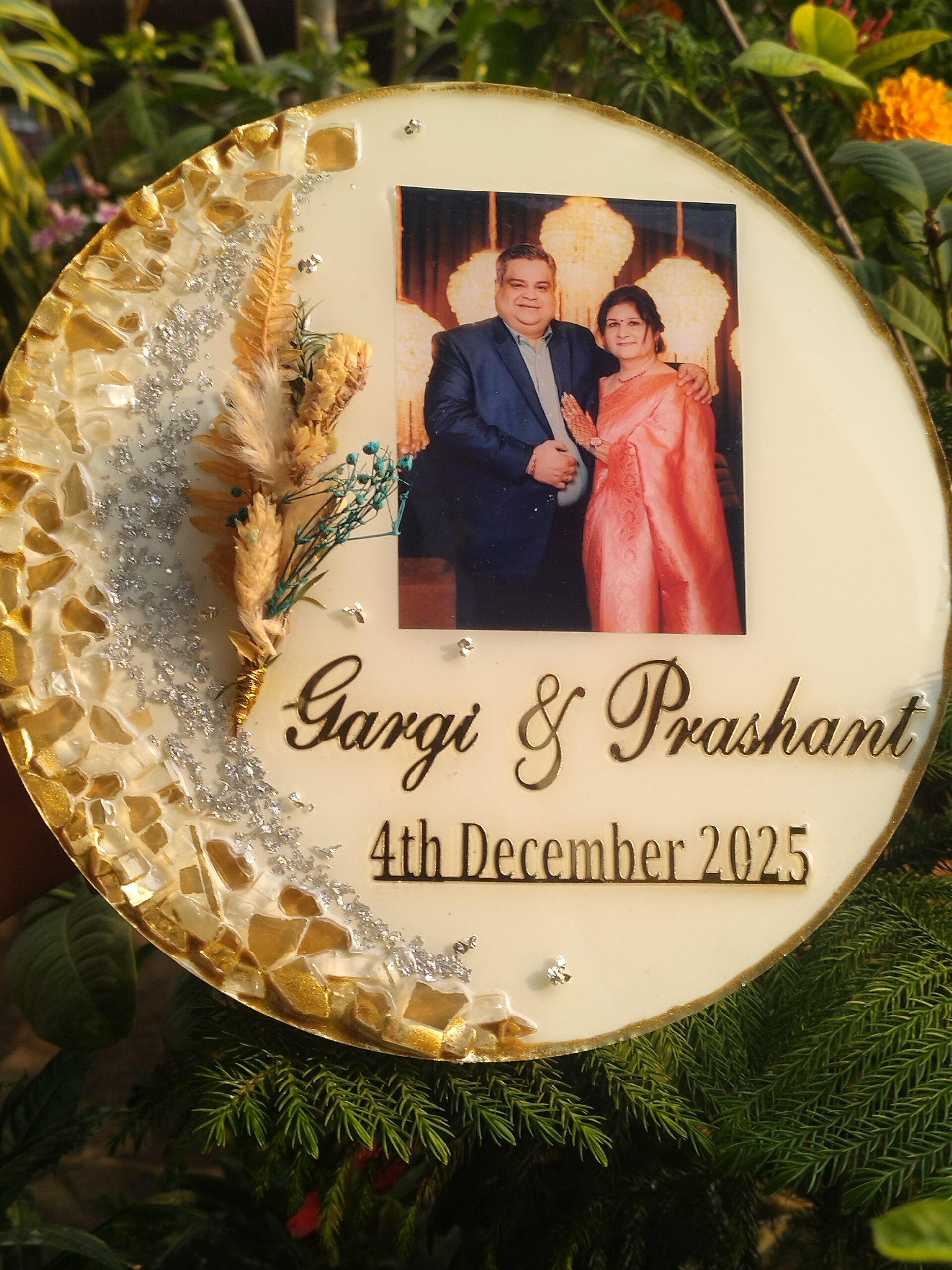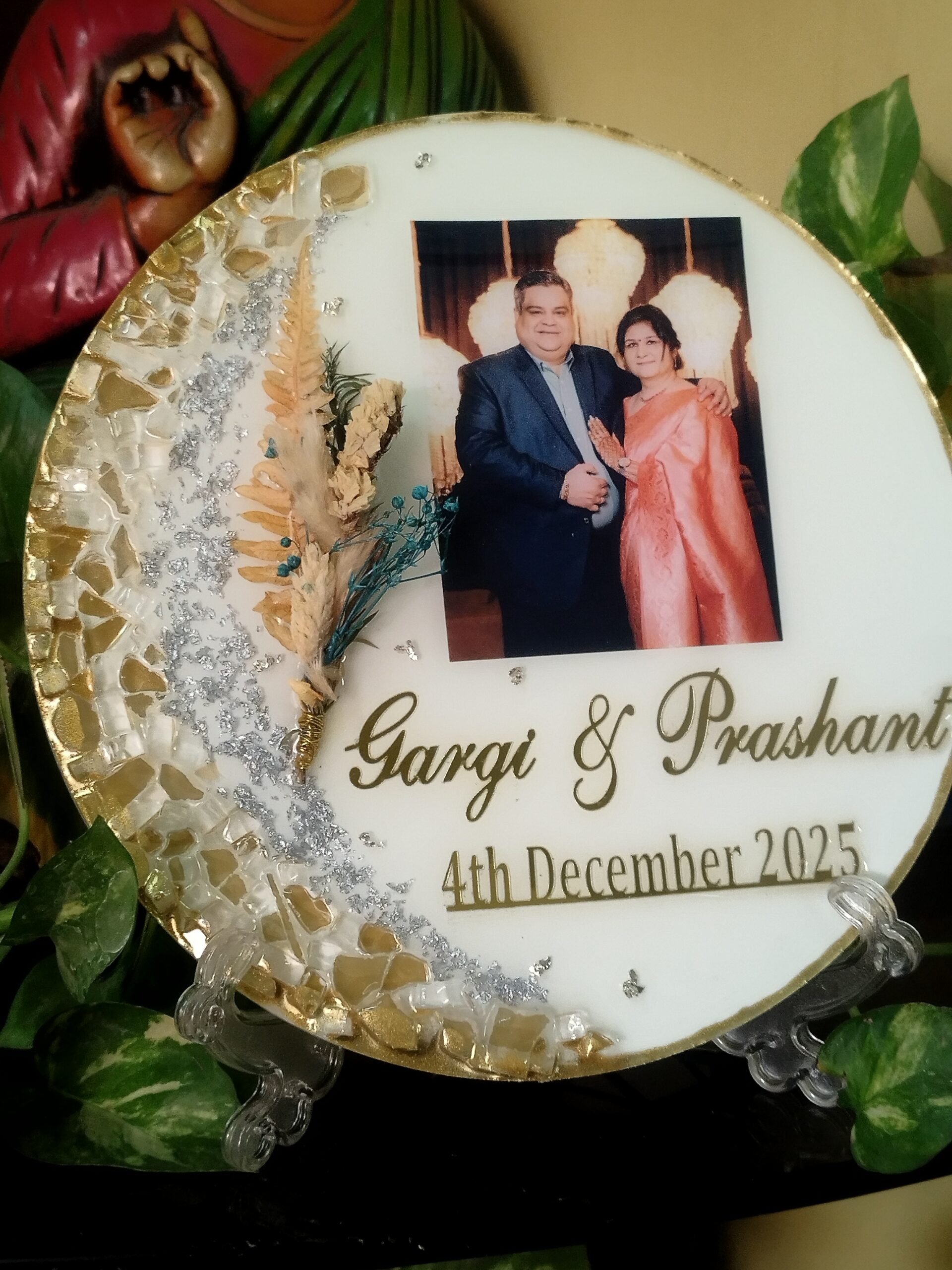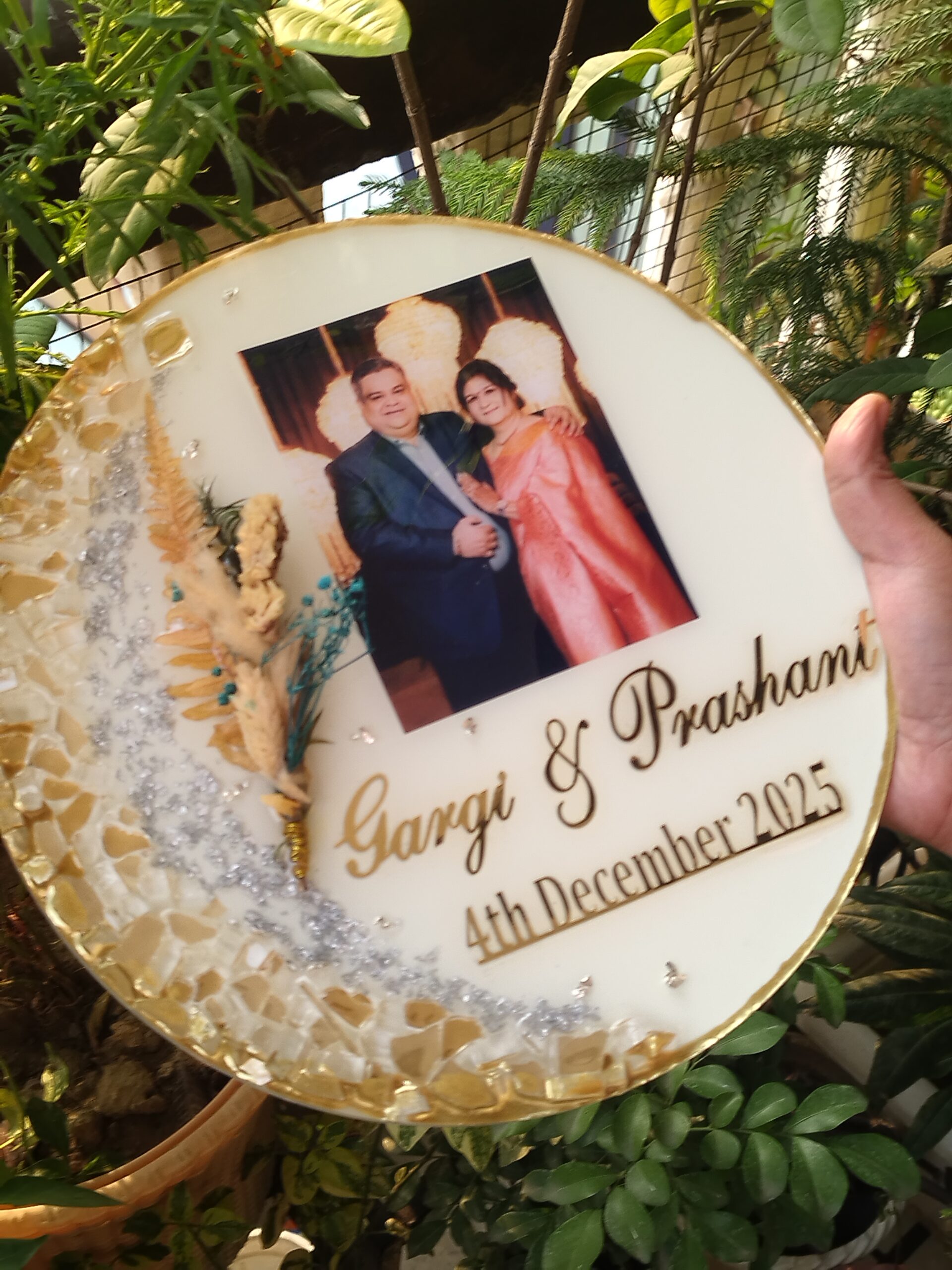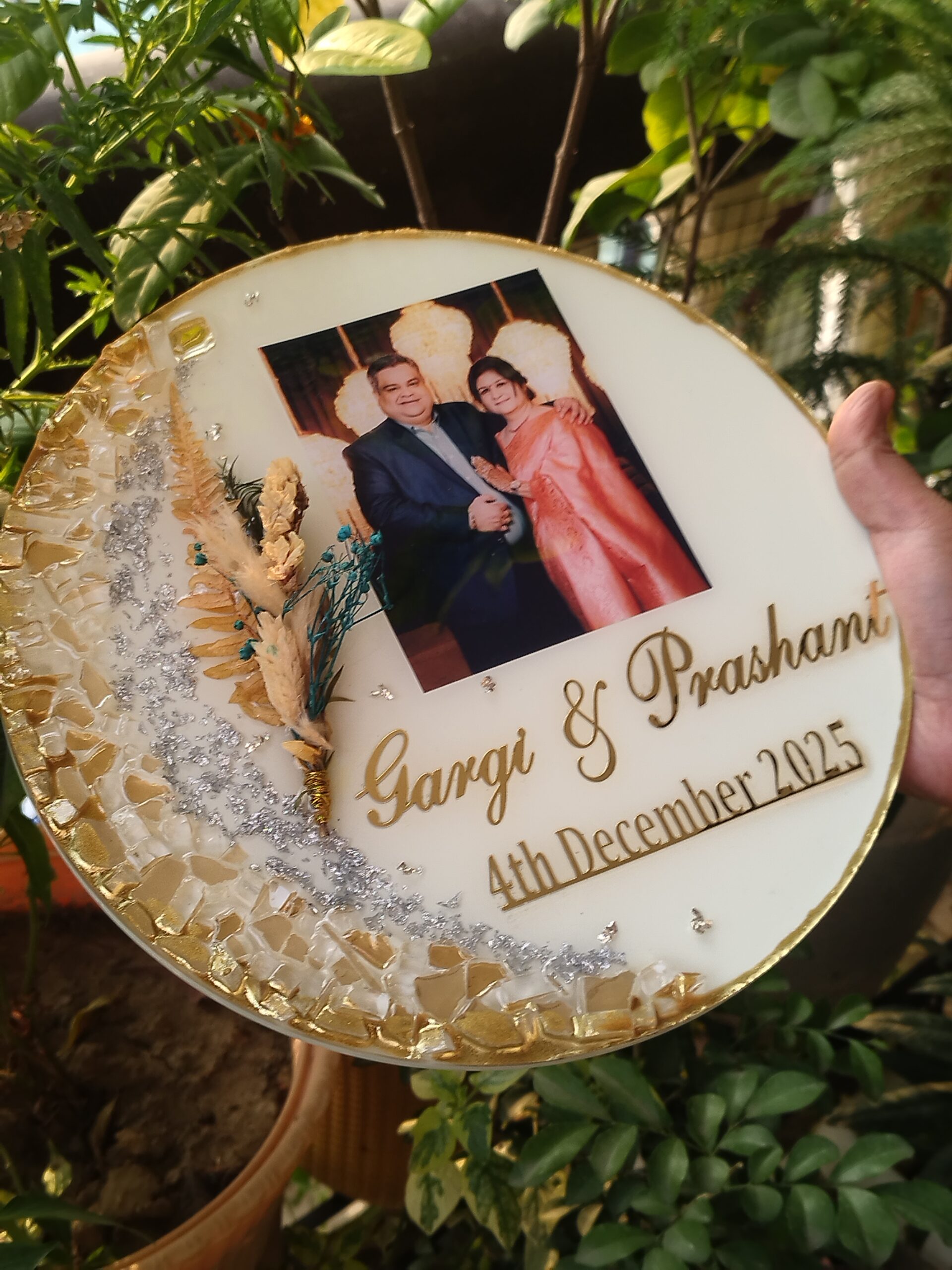 Make memories last forever with our Custom Resin Photo Keepsake Plate — designed to transform your favorite picture into an elegant piece of décor. Each frame is carefully handcrafted using premium resin and embellished with sparkling stones, dried botanical elements, and golden detailing that adds a luxurious finish.